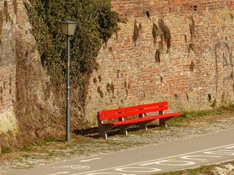 Keywords: bank red sun bench break sunny warm street lamp lantern wall city wall rest recover relax sit click
