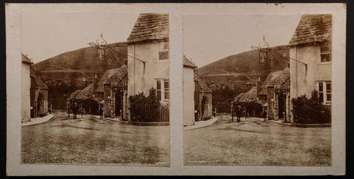 | Keywords: It's very hard to make out the sign on the pub, but it has a cross and something above it, possibly a figure. St George perhaps? The sign also has an AA badge attached to it, which gives a few clues as to earliest date.