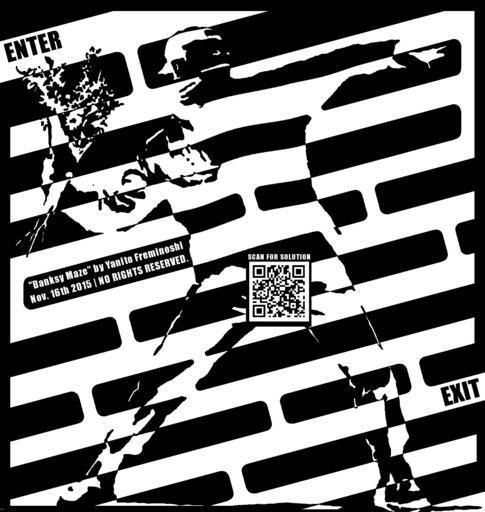 | Keywords: maze banksy rioter flower thrower flowerthrower mazes yanito freminoshi yanitofreminoshi maze art mazeart op art opart art blackandwhite monochrome text diagonal lines writing black and white Maze of the Banksy design of the flower thrower which shows a rioter about to throw a rock or Molotov cocktail, but instead is holding flowers. Maze's solution found at www.mybonusclaim.com/Banksy_Maze_4_mobile-casino.html#Ban... or by scanning in the QR Code on the rioter's crotch. The artist chose to put the QR Code to the solution there, because it seemd the most menacing location for that. Maze of the Banksy design of the flower thrower which shows a rioter about to throw a rock or Molotov cocktail, but instead is holding flowers. Maze's solution found at www.mybonusclaim.com/Banksy_Maze_4_mobile-casino.html#Ban... or by scanning in the QR Code on the rioter's crotch. The artist chose to put the QR Code to the solution there, because it seemd the most menacing location for that. |