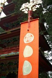 | Keywords: Banner7.jpg Tokugawa family crest on banner in front of pagoda at Toshogu Shinto shrine Nikko Tochigi Prefecture Japan during spring festival May 2005 I took this photo NikkoToshogu Festivals Roll-up banners in Japan Orange objects in Japan |