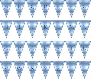 Keywords: banner bunting gingham flag check blue alphabet letter triangle party white fun summer spring holiday happy cross stitch thread material fabric embroidery