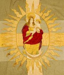 | Keywords: Banner of John II Casimir of Poland 2.jpg Banner of king John II Casimir Vasa detail Chorągiew króla Jana II Kazimierza Wazy fragment color silk gold cm 252 344 Stockholm Armémuseum Outer side Coats of arms of the Polish-Lithuanian Commonwealth framed by the Golden Fleece chain inner side Madonna and Child on the crescent moon surrounded by the nimbus Originally with inscriptions PRO GLORIA CRUCIS for glory of the Cross and PRO TUO PRAESIDIO in your Mary patronage Object history s 1650 commission John II Casimir of Poland ProvenanceEvent 1655 transfer Charles X Gustav of Sweden Kraków ProvenanceEvent 1685 transfer Livrustkammaren Stockholm own BurgererSF ST 28 1 s 1650 Unknown Poland Other versions PD-old-100 Halo religious iconography Collections of the Swedish Army Museum Banners from the Polish Vasa Collection Madonna on the crescent |