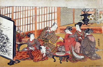 | Keywords: Banquet in a wealthy household (5758877457).jpg en <b>Accession Number </b> 1957 83 <b>Display Artist </b> Isoda Koryusai <b>Display Title </b> Banquet in a wealthy household <b>Series Title </b> Shikido torikumi juniban Twelve Bouts in the Way of Love <b>Suite Name </b> Shikido torikumi juniban <b>Creation Date </b> 1770-1774 <b>Medium </b> Woodblock <b>Height </b> 9 7/8 in <b>Width </b> 15 1/4 in <b>Display Dimensions </b> 9 7/8 in x 15 1/4 in 25 08 cm x 38 74 cm <b>Credit Line </b> Bequest of Mrs Cora Timken Burnett <b>Label Copy </b> This early full-color print was the cover of an erotic album The kinds of flowers and food and drink indicate that the time of year is New Year The scene takes place in a brothel where two men are selecting the courtesans with whom they will celebrate the New Year <b>Label Copy Spanish </b> Este grabado a todo color fue la portada de un lbum ertico El tipo de flores comida y bebida indica que es poca de Ao Nuevo La escena se lleva a cabo en un burdel donde dos hombres seleccionan a las cortesanas con las cuales celebrarn el Ao Nuevo <b>Collection </b> <a href http //www sdmart org/art/our-collection/asian-art rel nofollow >The San Diego Museum of Art</a> 2007-05-09 14 54 53 https //www flickr com/photos/thesandiegomuseumofartcollection/5758877457/ Flickr en thesandiegomuseumofartcollection PD-old-100 Files from the San Diego Museum of Art to be checked |