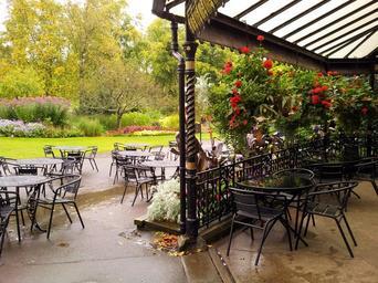 Keywords: bar café chair empty furniture garden green nature nobody outdoor outside park relax rest restaurant seat table