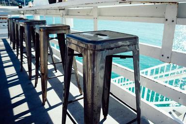 Keywords: bar stools outdoor seating chairs ocean view furniture metal rusty weathered black white summer sun lifestyle