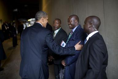 | Keywords: Barack Obama greets South African security personnel.jpg en President of the United States Barack Obama greets security personnel from South Africa as he waits to take the stage at the memorial service for Nelson Mandela at Soccer City in Johannesburg on 10 December 2013 2013-12-10 http //www whitehouse gov/photos-and-video/photogallery/president-obama-attends-nelson-mandela-memorial-service White House Creator Pete Souza DEFAULTSORT 20131210 PD-USGov Barack Obama in South Africa Death and state funeral of Nelson Mandela Soccer City Photographs by Pete Souza Uploaded by O'Dea Uploaded with UploadWizard |