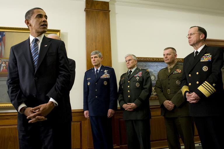 | Keywords: Barack Obama makes first visit to the Pentagon 1-28-09 2.jpg President Barack Obama addresses the media Jan 28 2009 during his first visit to the Pentagon since becoming commander-in-chief Obama and Vice President Joe Biden met with Defense Secretary Robert M Gates and all the service chiefs getting their input on the way ahead in Afghanistan and Iraq Here Obama is flanked by Gen Norton Schwartz U S Air Force chief of staff; Gen George W Casey U S Army chief of staff; U S Marine Gen James E Cartwright vice chairman of the Joint Chiefs Original file name hrs_090128-N-0696M-200a http //www defenselink mil/news/newsarticle aspx id 52860 2009-01-28 Petty Officer 1st Class Chad J McNeeley USN 150px PD-USGov-Military-Navy Files by User BrokenSphere Barack Obama in 2009 20090128 Barack Obama with military people 20090128 Michael G Mullen in 2009 20090128 Norton A Schwartz George W Casey Jr James E Cartwright Interior of The Pentagon |