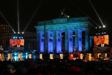 | Keywords: Barack Obama's video message during the Freedom Festival in Berlin 2009.jpg President Barack Obama's video message appeared during the Freedom Festival in Berlin Germany where U S Secretary of State Hillary Rodham Clinton represented the United States at the 20th anniversary celebration of the fall of the Berlin Wall Nov 9 2009 http //www flickr com/photos/statephotos/4440952192/sizes/o/ 2009-11-09 U S State Department Photo/Public Domain PD-USGov Barack Obama in Germany in 2009 Berlin Public speaking Obama Brandenburg Gate - politics Brandenburg Gate at night 20091109 2009 events in Berlin 20091109 November 2009 in Germany 20091109 2009 in politics 20091109 Blue light |