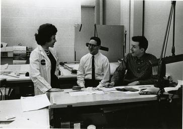 <b>Summary</b>: In 1964, Barbara Kegerreis Lunde (b. 1937) was an aerospace engineer at the Goddard Space Flight Center of the National Aeronautical and Space Administration (NASA), and is shown conferring with unidentified colleagues; by the mid-1980s, she was working on fiber optics research in the private sector. The caption on the reverse of this NASA photograph explained that the "lady space scientist" had become an engineer "because she liked dealing with absolute facts," and added, "she also likes bikini swim suits." In 1986, Lunde, by then a fiber optics engineer at Northwestern Bell Telephone Company, began marketing a line of silver-coated nylon underwear (the brand was called "Silver Lining") said to help screen electromagnetic pulses from televisions, computers, and microwave ovens. See "Computer Softwear," Washington Post, July 20, 1986, and "High-Tech Skivvies for Scriveners," Chicago Tribune, August 20, 1986