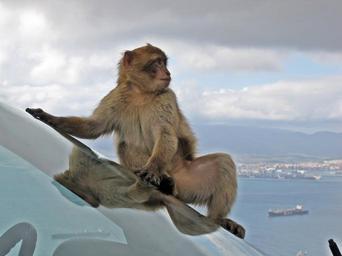 Keywords: barbary macaque wildlife monkey animal car window cute outside rock of gibralter bay harbor