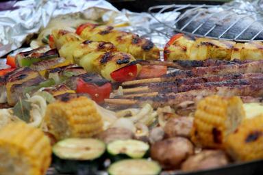 Keywords: barbecue rotisserie spit meat grill eat corn zucchini fish torches