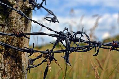 Keywords: barbed wire fence post wood pile wire wooden posts caution agriculture nature