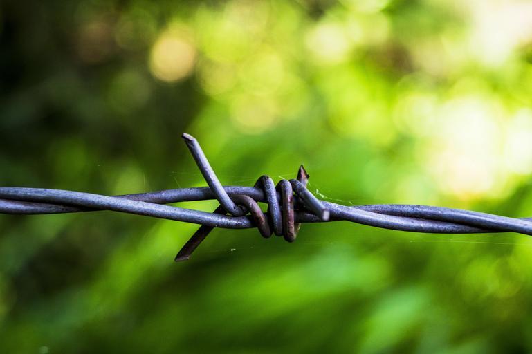 Keywords: barbed wire fence wire metal thorn demarcation limit close rusted risk security prison stainless barrier caution wiring