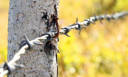 Keywords: barbed wire pasture fence barrier rod pile lock up wire barb nail a rusty rust rusty metal