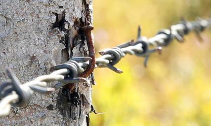 Keywords: barbed wire pasture fence barrier rod pile lock up wire barb nail a rusty rust rusty metal