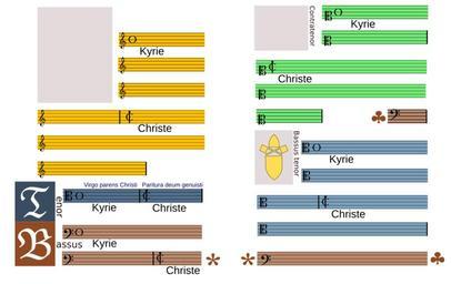 | Keywords: Barbireau Kyrie page layout.svg en Schematic diagram of page layout in a 16th-century musical part book J Barbireau Kyrie from Missa Virgo Parens Christi; original manuscript page see File Barbireau illum jpg 2013-02-12 13 15 19 own Future Perfect at Sunrise cc-zero Uploaded with UploadWizard Jacques Barbireau Musical manuscripts Mensural notation |