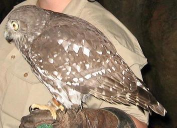 | Keywords: Barking owl 1.jpg en The Barking Owl or Winking Owl Ninox connivens is a nocturnal bird species native to mainland Australia and parts of Papua New Guinea They are a medium-sized brown owl and have an extremely characteristic voice that can range from a barking dog noise to a shrill woman-like scream of great intensity Barking owls are often said to be the source to the myths and legends surrounding the Bunyip Own Demiurge11 2009-01-29 Ninox connivens captive | ||||