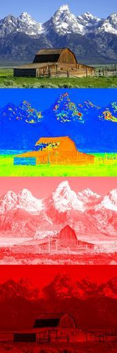 | Keywords: Barns grand tetons HSV separation.jpg This takes an image Image Barns grand tetons jpg and displays the H S and V elements of it Note that the H element is the only one displaying colour Compare the dark on the left side of the barn roof and the white of the snow; in both cases these have colour but the saturation is very low causing them to be near-greyscale; the intensity of the barn is much lower than the snow The green of the grass is highly saturated and of moderate intensity; the blue of the mountains is consistent in colour but varies in intensity and saturation; and the sky has constant colour and intensity but varying saturation Generator code In MATLAB <pre>RGBimage imread 'barns_grand_tetons_reduced jpg' ; height width depth size RGBimage ; HSVimage rgb2hsv RGBimage ; Caution MATLAB's hsv2rgb routine is very memory-hungry I had to halve the size of the source image to avoid running out or memory even with a lot of swap space allocated Newer versions of matlab need outputimage zeros height 4 width depth 'double' ; outputimage double zeros height 4 width depth ; for w 1 width for h 1 height outputimage h w 1 HSVimage h w 1 ; Copy H S and V for normal image outputimage h w 2 HSVimage h w 2 ; outputimage h w 3 HSVimage h w 3 ; outputimage h+height w 1 HSVimage h w 1 ; Copy H only for first component outputimage h+height w 2 1; outputimage h+height w 3 1; outputimage h+ 2 height w 2 HSVimage h w 2 ; S only for second component outputimage h+ 2 height w 1 1; outputimage h+ 2 height w 3 1; outputimage h+ 3 height w 3 HSVimage h w 3 ; V only for third component outputimage h+ 3 height w 1 1; outputimage h+ 3 height w 2 1; end end im2 hsv2rgb outputimage ; image im2 ; imwrite im2 'HSV_separation jpg' 'jpeg' ;</pre> Based on the public domain photo Image Barns grand tetons jpg Code above and resulting output by Mike1024 en wikipedia 2006-06-02 Mike1024 original upload log page en wikipedia Barns_grand_tetons_HSV_separation jpg 2006-06-02 17 47 Mike1024 800×2392×8 369530 bytes <nowiki> Summary This takes an image Image Barns grand tetons jpg and displays the H S and V elements of it Note that the H element is the only one displaying colour Compare the dark on the left side of the barn roof and</nowiki> HSV John Moulton barn |