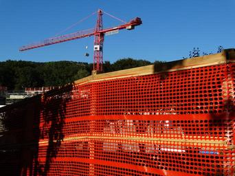 Keywords: barrier build demarcation red woody blue sky load crane wood fence site