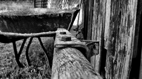 Keywords: barrow old work tool rusty dirty equipment garden gardening farm carry wooden renovation housework black and white wood backyard