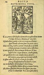 | Keywords: Barthélemy Aneau “Matrimonii Typus” from Picta poesis (1552).jpg la <blockquote> Corpore sit duplicis formae Hermaphroditus in uno<br /> Unáque sit facies foeminae una viri <br /> Oscula dein gemino velut ore reciproca dentur <br /> Quae blando alternae sunt in amore vices <br /> Hinc utrunque Sophos carnem unam dicat at inde<br /> Dum pugnant Satyrus rideat esse duos <br /> Carne quòd esse duos cornutus Hebraeus in una<br /> Iusserit hoc corpus denotat Androgynon <br /> At quòd non deceant divisos iurgia sponsos <br /> Id Satyrus μῶρος qui reprehendat adest <br /> Casibus adversis solatia utrinque ferendis <br /> Sintque decussatim brachia iuncta cruce <br /> Sic ut dactylion dextro super ubere laeva <br /> Corque sinistro habeat dextra manus latere <br /> Ille fidem sponsam vivacem hoc signat amorem <br /> Unà ut conveniant hinc amor inde fides <blockquote/> en Let there be a Hermaphrodite of double shape in a single body; and let one face be a woman s the other a man s Let kisses then be given and taken as if with a twin mouth which are the shared exchanges of sweet love Let on the one side the Sage say that both are one flesh; but on the other when they fight let the satyr laugh that they are two For the horned Jew commanded that they be two in a single flesh; this body is what the Androgyne expresses But since it is not right that wedded folk should quarrel the silly satyr is there to find fault with this And because they show consolation to each other in bad times let their arms be linked in a ten-shaped cross so that the left hand s ring be over the right breast and the right cover the heart on the left side The one means true-pledged faith the other long-lived love so that the two from one side faith from the other love might meet 1552 https //archive org/stream/pictapoesisutpic00anea page/14/mode/1up Picta poesis ut pictura poesis erit - page 14 Barthélémy Aneau 1510 1561 other versions Custom license marker 2015 03 18 PD-old-100 Uploaded with UploadWizard Picta Poesis 1552 engravings Intersex in art |