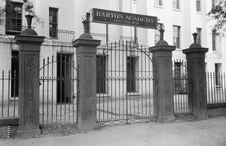 Keywords: Barton Academy 06.jpg Barton Academy Government Street Mobile Mobile County AL WROUGHT IRON GATES Historic American Buildings Survey Library of Congress Prints Photographs Division HABS or HAER or HALS Reproduction number HABS ALA 49-MOBI 34-19 LOC-image hhh al0395 1935-02-21 E W Russell photographer AL-32-19 Barton Academy Iron gates in Alabama School signs in Alabama |