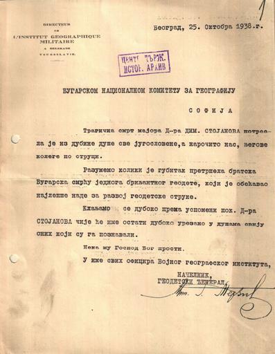 | Keywords: BASA-1524K-1-31-1-Bulgarian National Committee for Geography.JPG Съболезнователно писмо от Института за военна геог афия в Белг ад до Бълга ския национален комитет за геог афия по повод смъ тта на ди екто а на военния институт майо Димитъ Стоянов Letter from Serbian commitee for military geography to Bulgarian National Committee for Geography 1938-10-25 unknown ЦДА 1524K Бълга ски национален комитет за геог афия 1 31 1 credit line exhibition history BASA Спасими <span class signature-talk >talk</span> 2015-12-04 other versions Anonymous-EU Bulgarian National Committee for Geography |