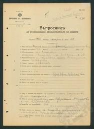 | Keywords: BASA-F. 2123-1-OB105611D-170l.jpg Въп осник за установяване на самоличност на Ки ил иколов Гео гиев задъ жан в Ди екция на полицията в София на 22 ма т 1942 г азпитан на 23 ма т 1942 г пъ ва част Questionnaire for identification of Kiril Nikolov Georgiev detained in Police Directorate in Sofia - March 23 1942 part I 1942-03-23 author ЦДА 2123К 1 ОБ 105611 Д 170 лице credit line exhibition history Bulgarian Archives State Agency unknown other versions en Questionnaire for identification of Kiril Nikolov Georgiev detained in Police Directorate in Sofia - March 23 1942 part I bg Въп осник за установяване на самоличност на Ки ил иколов Гео гиев задъ жан в Ди екция на полицията в София на 22 ма т 1942 г азпитан на 23 ма т 1942 г пъ ва част Central State Archive Sofia author 1942-03-23 Anonymous-EU Documents in the Bulgarian Archives |
