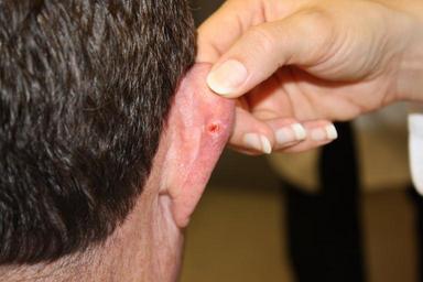 | Keywords: Basal cell carcinoma (1).jpg A red ulcerated lesion surrounded by a white border on the skin of the right ear Ulcerated basal cell carcinoma with characteristic pearly rim Topics/Categories Anatomy -- Skin Cancer Types -- Skin Cancer Cells or Tissue -- Abnormal Cells or Tissue Type Color Photo Source National Cancer Institute Kelly Nelson Photographer 9235 2012-03-02 Reuse Restrictions None - This image is in the public domain and can be freely reused Please credit the source and/or author listed above Kelly Nelson Photographer PD-USGov-HHS-NIH Media from National Cancer Institute Visuals Online Images uploaded by Fæ Basal-cell carcinoma |