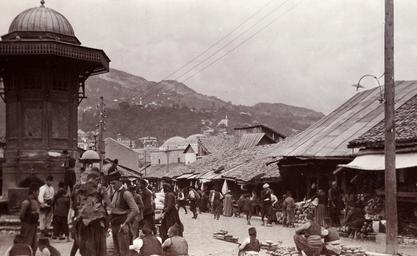 | Keywords: Bascarsija. Fortepan 76314.jpg hu Bascarsija Location Bosnia and Herzegovina Sarajevo Tags street view genre painting bazaar hillside Title Bascarsija http //www fortepan hu/_photo/download/fortepan_76314 jpg 1903 Fortepan 76314 http //www fortepan hu/_photo/download/fortepan_76314 jpg http //www fortepan hu/ lang en img 76314 Unknown The release at fortepan hu is CC-BY-SA-3 0 As the photographer is unknown or pseudonymous and the photograph is Age 1903 01 01 years old it is considered public domain both in the country of publication Hungary and the USA where Wikimedia Commons is hosted See Fortepan HU for more information on related uploads 43 51 35 94 N 18 25 52 36 E heading S PD-anon-70-EU PD-1923 PD-1923 DEFAULTSORT Fortepan 076314 1903 photographs Images uploaded by Fæ Baščaršija main square |