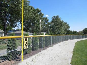 Keywords: baseball field fence trees track park outfield outdoors sport sports game athletics athletic activity grass