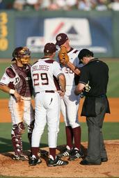 Keywords: baseball game players coach pitcher's mound sport field competition summer team play mound infield athlete pitcher uniform athletics catcher catcher's mask meeting discussion ruling umpire official men activity college play offs texas