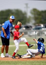 Keywords: baseball little league little ball sport player game boy team field youth uniform base play summer park grass athlete athletic competition helmet young male dirt fence runner coach red slide glove second base
