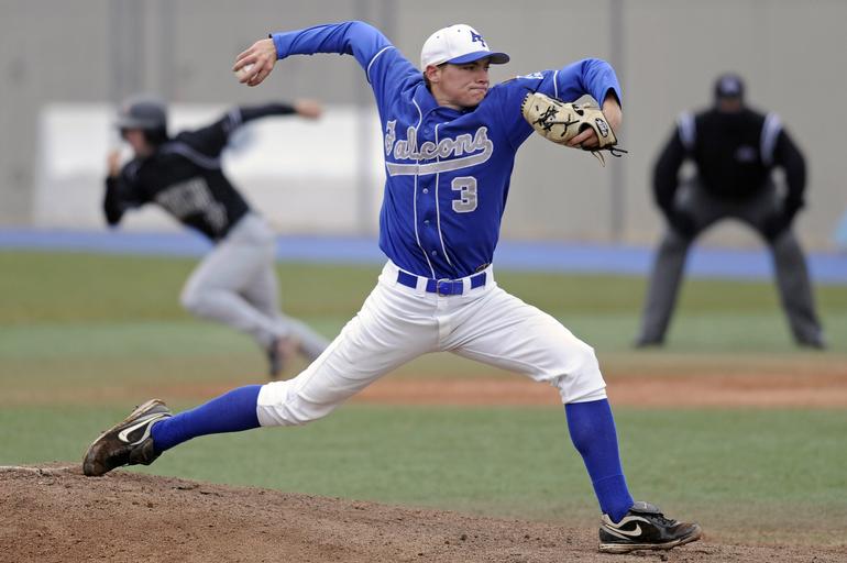 Keywords: baseball pitcher ball throw athlete college game sport infield field mound pitch uniform male glove competition base runner umpire