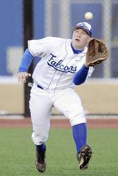 Keywords: baseball player outfielder ball catch glove focus sport playing action college game athlete grass throw