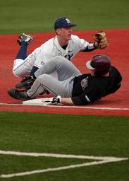 Keywords: baseball third base tag steal attempt slide play infield runner ball field sport male glove concentration focus ground game out athlete players