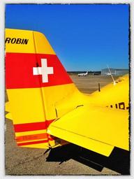 Keywords: basel airport prior to robin light aircraft sky blue yellow switzerland