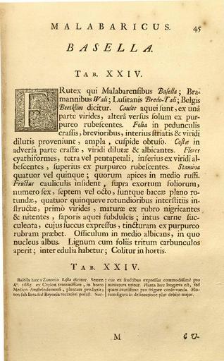 | Keywords: Basella-Hortus Malabaricus-V7-45.png Volume 7 Page 45 Basella of Hortus Malabaricus continens regni Malabarici apud Indos cereberrimi onmis generis plantas rariores Latinas Malabaricis Arabicis Brachmanum charactareibus hominibusque expressas http //www biodiversitylibrary org/bibliography/707 1688 Reede tot Drakestein Hendrik van PD-old-100 Hortus Malabaricus Volume 7 Basella alba | ||||