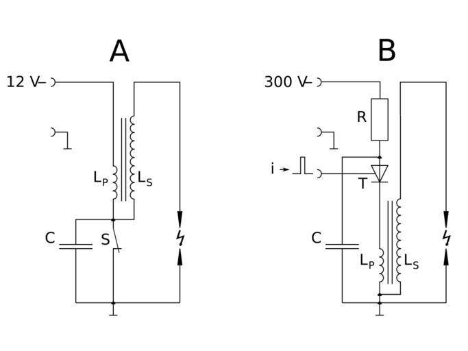 Keywords: Basic ignition coil circuits.svg drawing A with contact breaker; drawing B operated by a thyristor but with 300 V + above own 2007-05-04 Thuringius SVG electrical schematics Ignition circuits