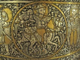 | Keywords: Bassin Syrie 1.JPG Basin with a procession of officials and four riders in roundels exterior band ; friezes of animals and coats-of-arms interior band Bassin représentant une procession de dignitaires et quatre cavaliers dans des rondeaux décor extérieur ; frises d'animaux réels ou imaginaires et de blasons décor intérieur brass hammered ; decoration engraved gold silver niello ca 1320 1340 cm 22 5 50 2 Institution Musée du Louvre object department Islamic art object history place of creation Syria or Egypt accession number Louvre number 26 21176 Fabos 2005 06 05 Atelier graphique Baptistère de saint Louis Riders in Islamic art |