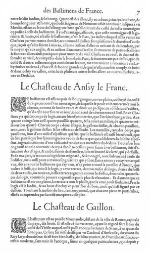 | Keywords: Bastiments v1 (Gregg 1972 p15) - Text for Verneuil, Ancy-le-Franc, Gaillon.jpg Page of text from Le premier volume des plus excellents Bastiments de France by Jacques I Androuet du Cerceau Scan Androuet Jacques 1576 Le premier volume des plus excellents Bastiments de France Paris Reduced size reprint Gregg International 1972 ISBN 9780576154086 2014-05-21 09 36 27 Creator Jacques I Androuet du Cerceau PD-Art-100 Le premier volume des plus excellents Bastiments de France Gregg 1972 reprint |