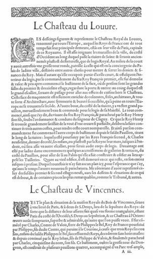 | Keywords: Bastiments v1 (Gregg 1972 p07) - Text for Louvre, Vincennes.jpg Page of text discussing the Château du Louvre and the Château de Vincennes from Le premier volume des plus excellents Bastiments de France by Jacques I Androuet du Cerceau <br /><--previous page Space 10 next page--> Scan Androuet Jacques 1576 Le premier volume des plus excellents Bastiments de France Paris Reduced size reprint Gregg International 1972 ISBN 9780576154086 1576 Creator Jacques I Androuet du Cerceau PD-old-100 Le premier volume des plus excellents Bastiments de France Gregg 1972 reprint History of the Palais du Louvre 1576 Historical images of Château de Vincennes 1576 |