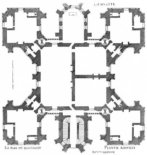 | Keywords: Bastiments v1 (Gregg 1972 p62) - La Muette plan.jpg Engraving from Le premier volume des plus excellents Bastiments de France by Jacques I Androuet du Cerceau plan of the Château de la Muette a former royal hunting pavilion in the Forêt de Saint-Germain-en-Laye Scan Androuet Jacques 1576 Le premier volume des plus excellents Bastiments de France Paris Reduced size reprint Gregg International 1972 ISBN 9780576154086 1576 Creator Jacques I Androuet du Cerceau PD-Art-100 Le premier volume des plus excellents Bastiments de France Gregg 1972 reprint Château de la Muette Saint-Germain-en-Laye Plans of castles in France Muette Saint Germain |