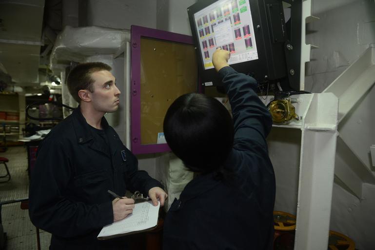 Keywords: Bataan Amphibious Ready Group, 2014 Deployment 140611-N-MW280-320.jpg en Aviation Boatswain's Mate Fuels Airman Donald Garrell from Jackson N J and Aviation Boatswain's Mate Fuels 2nd Class Dominique Marcus from Indianola Miss monitor and log fuel levels in tanks aboard the multipurpose amphibious assault ship USS Bataan LHD 5 Bataan with elements of the 22nd Marine Expeditionary Unit is operating in the U S 6th Fleet area of operations to augment U S Crisis Response forces in the region U S Navy photo by Mass Communication Specialist 3rd Class Chase Hawley/Released 2014-06-11 Petty Officer 2nd Class Chase Hawley https //www dvidshub net/image/1397300 140611-N-MW280-320 2014-06-13 20 57 USS BATAAN AT SEA PD-USGov-Military-Navy USS Bataan LHD-5 22nd Marine Expeditionary Unit Images from DoD uploaded by Fæ |