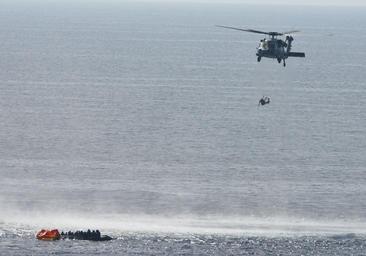 | Keywords: Bataan Amphibious Ready Group, 2014 Deployment 140606-N-HO612-647.jpg en An MH-60S Sea Hawk assigned to HSC-22 Sea Knights assists in the rescue of persons in distress for transport to the multipurpose amphibious assault ship USS Bataan June 6 Bataan provided food water medical attention and temporary shelter to 280 persons in distress after receiving a report that an Italian military marine patrol aircraft sighted six small vessels one of which was sinking Bataan with elements of the 22nd Marine Expeditionary Unit is operating in the U S 6th Fleet area of operations to augment U S Crisis Response forces in the region 2014-06-06 LHD 5 https //www dvidshub net/image/1390596 140606-N-HO612-647 2014-06-10 16 29 MEDITERRANEAN SEA AT SEA PD-USGov-Military-Navy MH-60S Seahawk 22nd Marine Expeditionary Unit Images from DoD uploaded by Fæ |