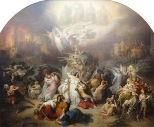 | Keywords: Batch Mattes 20130310 NP (27).JPG Artwork Creator Wilhelm von Kaulbach de Die Zerstörung Jerusalems durch Titus 1846 Oil on canvas size cm 585 705 Institution Neue Pinakothek 13 object history exhibition history credit line accession number WAF 403 own Photography by Mattes 2013-03-10 12 25 20 PD-old-100 reflection Kaulbach Wilhelm von ” Die Zerstörung Jerusalems durch Titus Work by Mattes 2013 Taken with Sony DSC-HX5VN User Mattes/Contributions/Topics/Arts User Mattes/Contributions/Topics/Germany/München Uploaded with Up ImageNote 1 664 22 1302 397 2626 2162 2 Detailabb 1 Die vier Propheten die den Untergang Jerusalems voraussagten Jesaja Ezechiel Hesekiel und Daniel Reihenfolge die rechte Figur zeigt auf Titus hinunter ImageNoteEnd 1 ImageNote 2 1843 531 761 563 2626 2162 2 Detail 2 Titus als Feldherr mit kleinem Triumpzug ImageNoteEnd 2 ImageNote 3 1977 1296 646 816 2626 2162 2 Detail 3 Die christliche Familie links Maria mit dem Jesuskind und Johannes Daneben Jesus Ein Esel frißt Disteln Warmer Farbkolorit ImageNoteEnd 3 ImageNote 4 1764 1581 213 455 2626 2162 2 Detail 4 Jüdische Kinder flehen die christliche Familie an sie mitzunehmen ImageNoteEnd 4 ImageNote 5 584 1649 411 430 2626 2162 2 Detail 5 Ein Jude hütet den geretteten Tempelschatz mit Schwert ImageNoteEnd 5 ImageNote 6 36 1375 552 610 2626 2162 2 Detail 6 Ahawat Verkörperung der stets flüchtenden Juden ImageNoteEnd 6 ImageNote 7 14 1054 649 328 2626 2162 2 Detail 7 Dämonen verfolgen Ahawat und treiben ihn aus der Stadt ImageNoteEnd 7 ImageNote 8 69 155 761 902 2626 2162 2 Detail 8 Der brennende Tempel von Jerusalem höllengleich dargestellt ImageNoteEnd 8 ImageNote 9 758 401 1028 469 2626 2162 2 Detail 9 Engel mit Ruten bzw Flammenschwertern ImageNoteEnd 9 ImageNote 10 941 780 779 451 2626 2162 2 Detail 10 Engel mit Trompeten ImageNoteEnd 10 ImageNote 11 927 1094 714 776 2626 2162 2 Detail 11 Hohepriester begeht Suizid daneben seine Frau die ihn anfleht sie vorher auch zu töten Rechts daneben seine Kinder ImageNoteEnd 11 ImageNote 12 671 1213 375 440 2626 2162 2 Detail 11 Mutter schützt ihr Baby vor Kanibalisten ImageNoteEnd 12 |