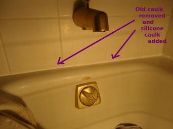 | Keywords: Bathtub second floor facing street recaulked.jpg en Silicone caulk has been added to a crack between the bathtub and the tiles Silicone is flexible and will work as a moisture barrier to keep water from the tub and shower away from the walls 2012-08-08 own Tomwsulcer cc-zero Uploaded with UploadWizard Bathtubs Handyman projects |