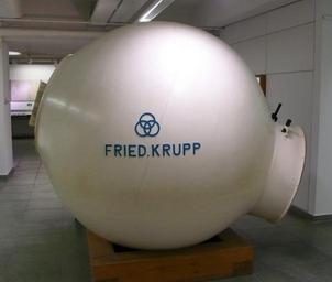 | Keywords: Bathyscaph Trieste Krupp.jpg de Trieste Stahlkugel Fehlguss ausgestellt im Deutschen Museum München 1 Schalttafel für die Außenbeleuchtung 3 Scheinwerfer Quecksilberdampflampen an der Unterseite des Schwimmkörpers und 2 Glühlampen in Stahlgehäusen am Beobachtungsfenster der Tauchkugel und im Vorzimmer Ateliers de Constructions Mécaniques de Vevey S A Vevey Schweiz 2 Schalttafel zur Betätigung der Ballastschleusen und anderen Einrichtungen Ateliers de Constructions Mécaniques de Vevey S A Vevey Schweiz 3 Schalttafel für die Antriebsmotoren Ateliers de Constructions Mécaniques de Vevey S A Vevey Schweiz 4 Reservematerial 5 Chronometer des Fabrikats wie es auch bei den Ballonflügen in die Stratosphäre 1931 und 1932 von Auguste Piccard benutzt wurde Ateliers de Constructions Mécaniques de Vevey S A Vevey Schweiz 6 Totalisator zur Kontrolle der Ballastabgabe Mit zwei Sekunden-Zählwerken die nur laufen wenn der Strom der zugehörigen Ballastschleuse unterbrochen ist und Ballast abgegeben wird Da der Ballastausfluß jeder Schleuse ziemlich genau 10 kg je Sekunde beträgt kann man sofort erkennen wie viel Ballast verbraucht worden ist Langines Compagnie des Mantres Longines Francillon S A St Imier Schweiz 7 Manometer die zur Ermittlung der Tauchtiefe den Wasserdruck messen Haenni Jegenstorf Schweiz 8 Hochdruckventil 1200 kp/qcm Maschinenfabrik Burckhardt Aktiengesellschaft Basel Schweiz 9 Wasserdichter und explosionsgeschützter Fernsprechapparat für Batteriebetrieb mit einer Buchse im Schwimmkörper so dass nach dem Auftauchen eine Kabelverbindung mit Begleitfahrzeugen hergestellt und so beim Tauchen bis in geringe Tiefen aufrechterhalten werden kann Società Italiana Telecomunicazioni Siemens s p a Milano Italien 10 Automatische Filmkamera Bolex H 16 Reflex Paillard S A Ste Croix Schweiz 11 Photographische Kamera Exakta Ihagee Kamerawerk A G Dresden 12 Anzeigeinstrument des Nickelwiederstandsthermometers zur Messung der Temperatur des Tragebenzins Bosco Co S p a Torino Italien 13 Pendel zur Bestimmung der Trimmlage 14 Zink-Silber-Akkumulatoren zum Betrieb elektrischer Geräte der Ballastschleusen der Haltemagnete der Antriebsmotoren der Ventilatoren der Scheinwerfer Lampen und Innenbeleuchtung 330 Zellen zu je 1 5 Volt Electrona S A Boudry Schweiz 15 Pressluftflaschen zum Ausblasen des Wassers aus Vorzimmer und Einsteigeschacht AGA A G Pratteln-Zürich-Genf 16 Sauerstoff-Flaschen der Belüftungsanlage um den Sauerstoffgehalt der Atemluft in der Tauchkugel zu erneuern AGA A G Pratteln-Zürich-Genf 17 Natronpatronen Aus den Druckflaschen in einem Injektor strömender Sauerstoff saugt Raumluft durch diese drei Patronen Kohlendioxyd wird absorbiert und die gereinigte Luft gelangt gemischt mit Sauerstoff im Kreislauf in die Kabine zurück Drägerwerk Lübeck 18 Schalttafel Ateliers de Constructions Mécaniques de Vevey S A Vevey Schweiz 19 Unterwassertelefon nach Russel Lewis Laboratorium für Unterwasserschall New London Connecticut USA mit dem auch während des Tauchens eine Sprech- oder Signalverbindung mit dem Begleitschiff aufrechterhalten werden kann Die beim Sprechen auf das Mikrofon auftreffenden Schallwellen werden im Bereich von 300 bis 3000 Hertz in elektrische Schwingungen und nach Verstärkung zur à bertragung im Wasser in Unterschallschwingungen von 8387 bis 11087 Hertz umgewandelt Einseitenband-Modulation mit unterdrücktem Träger Beim Empfang findet der umgekehrte Vorgang statt 20 Echolot 21 Log zum messen der Vertikalgeschwindigkeit 22 Innenbeleuchtung mit 6 kleinen Glühlampen zur Beobachtung der Instrumente Sie beleuchten die weiß gestrichene Decke der Tauchkugel und sind gegen die Besatzung abgeschirmt um Blendwirkung zu vermeiden 23 Traggerüste für die Geräteausstattung Verformungen der Kugel durch Temperaturänderungen werden von Schraubfedern aufgenommen die in Bohrungen am oberen Ende der Stangen sitzen und einen Messingkolben gegen die Kugelwand drücken Ateliers de Constructions Mécaniques de Vevey S A Vevey Schweiz 24 Sitze 25 Fußboden der den Keller abdeckt Im Keller werden Alkalipatronen zur Erneuerung der Atemluft Druckgasflaschen zum Ausblasen des Einsteigschachtes nach einer Tauchfahrt und anderes Reservematerial aufbewahrt 26 Tauchkugel Fried Krupp Essen 27 Einsteigeluke 28 Hauptbeobachtungsfenster 29 Tonbandgerät Kudelski Enregistreur autonomes Nagra Paudex-Lausanne own Reinraum 119 September 2010 Trieste submarine 1953 |