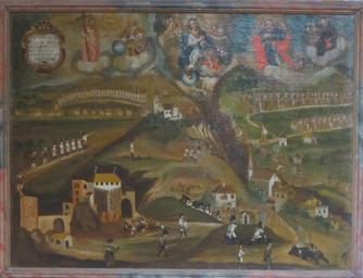 | Keywords: Battaglia di Segonzano.jpg Art Photo unknown author battaglia di Segonzano del 1796 tra le forze francesi e quelle austro-ungariche; in alto da sinistra sono raffigurati la santa Trinità la Madonna Immacolata san Rocco e sant'Antonio abate patroni rispettivamente di Segonzano Piazzo del castello e della cappella sopra a Piazzo Al centro del dipinto c'è la chiesa della ss Trinità di Segonzano in basso a sinistra il castello di Segonzano in basso a destra le frazioni di Piazzo e Parlo con la Chiesa dell'Immacolata e la cappella di sant'Antonio ca 1796-1800 2014-06-19 17 08 08 own PD-old-100 XIX century Italy Uploaded with UploadWizard Segonzano 1790s paintings in Italy 1790s paintings from Italy 18th-century paintings of battles Photos of places by User Syrio |