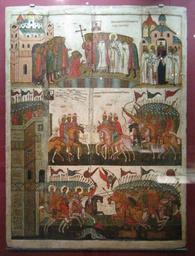| Keywords: Battle between Novgorod and Suzdal BIG.jpg Битва новго одцев и суздальцев в 1170 году ЧУДО ОТ ИКО Ы «БОГО АТЕРЬ З А Е ИЕ» БИТВА ОВГОРОДЦЕВ С СУЗДАЛЬЦА И Се едина вто ая половина XV века овго од Де ево липа паволока левкас; темпе а 165 x 119 5 аходилась ве оятно в це кви Святого Димит ия в Кожевниках; в XIX веке пе енесена в часовню Святого Ва лаама Хутынского а позднее в це ковь иколы Кочанова Поступила в овго одское епа хиальное д евлех анилище в 1912 году Рестав и ована в 1913 году в овго оде П И Юкиным; в 1957 году в ГЦХР А Рябининой ГО З инв КП 2184 ДРЖ 956 Battle between Novgorod and Suzdal in 1170 own photo by shakkom 2011 mid of XV c anonimus PD-Art Battle between Novgorod and Suzdal icon Novgorod museum Exhibition Sainte Russie Moscow 2011 - icons |
